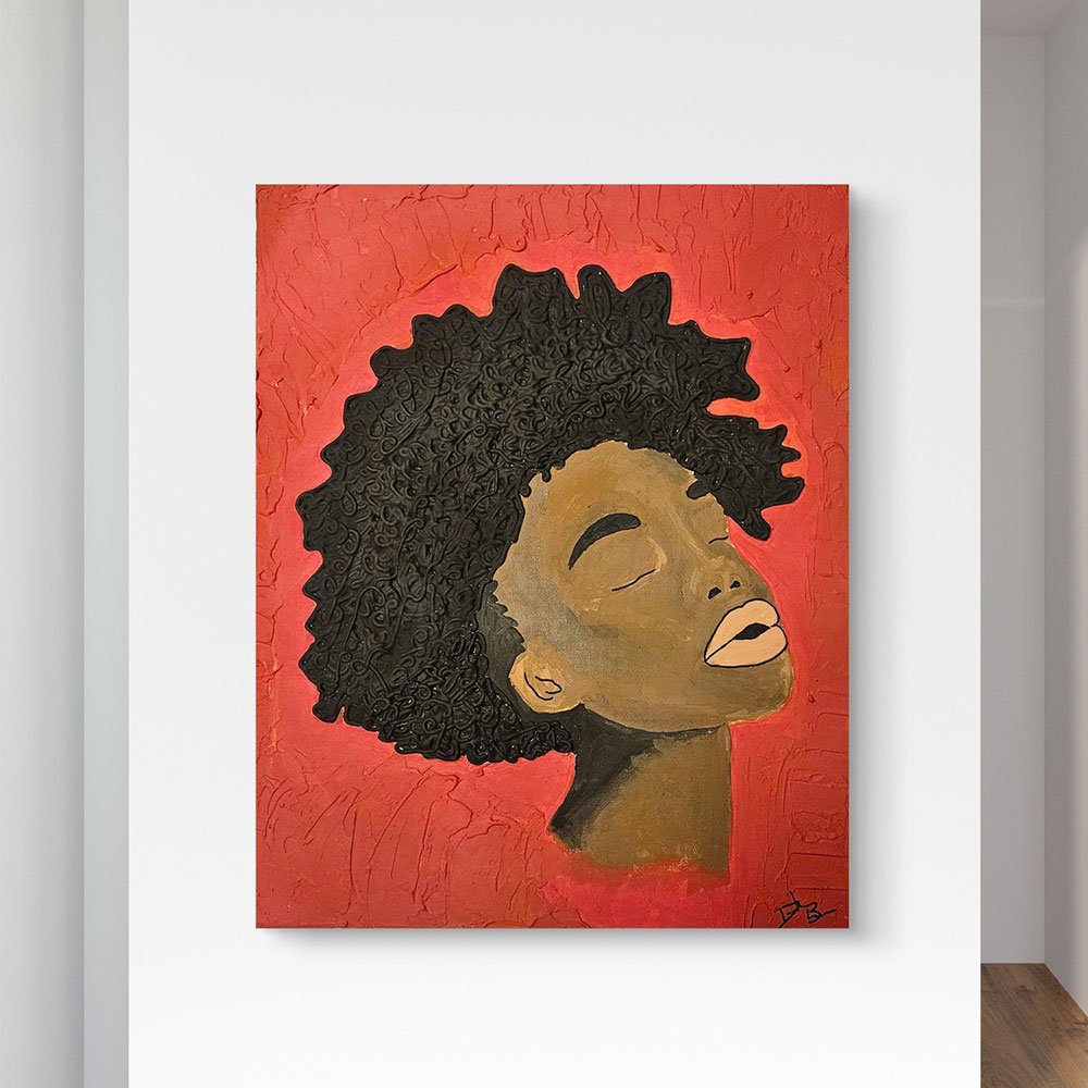 This piece celebrates the strength, beauty, and resilience of Black women. Her natural hair stands as a crown, bold and unapologetic, while her full lips speak of stories untold—tales of love, struggle, and triumph. The deep red background, rich with texture, symbolizes both passion and power, a backdrop fitting for a queen. Every brushstroke carries a message: strength is soft, beauty is bold, and every texture tells a story. This artwork is not just a portrait—it’s a statement. 16×20